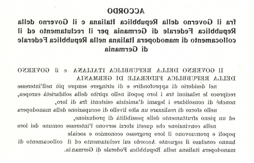 italian casting – un casting in italiano relates to the signing of the treaty between the Italian Republic and the Federal Republic of Germany for the recruitment and placement of Italian labor in 1955. The art work is an intervention in and collaboration with the Italian Cultural Institute in Cologne.